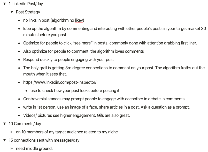 After taking multiple Linkedin courses and polling people who are really good at it I came up with this strategy below (clipped from my Notion Dashboard):